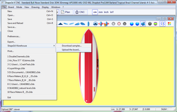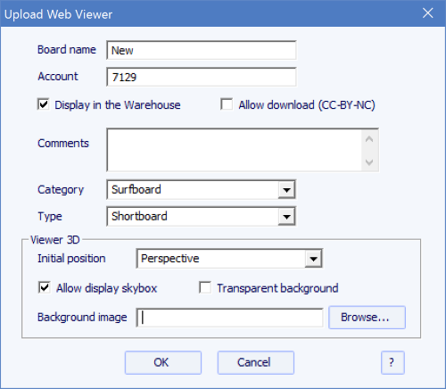 - From the menu Files -> Shape3d Warehouse -> Upload the board... in all the modes.